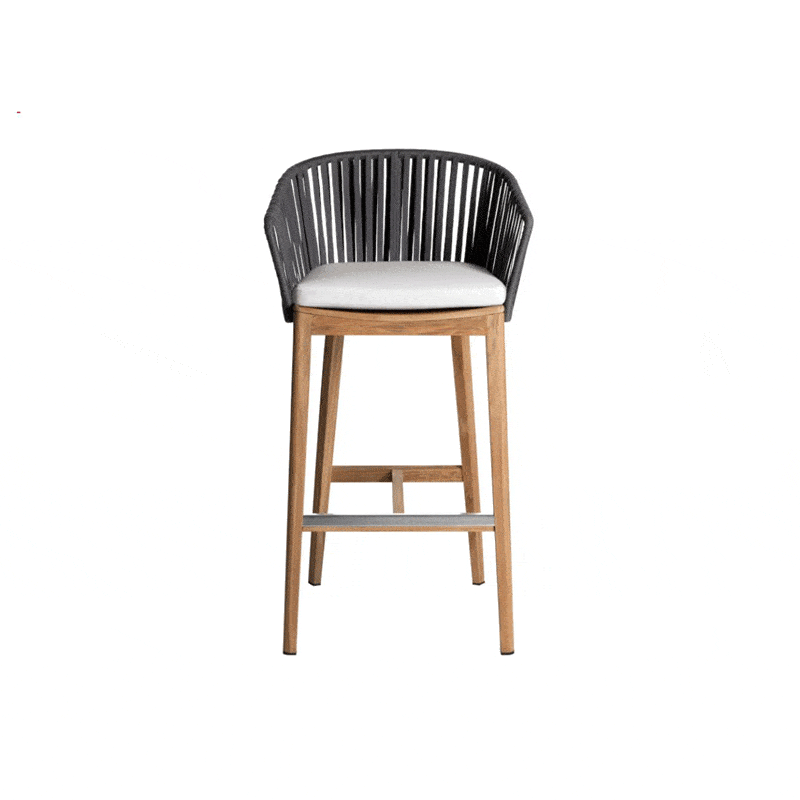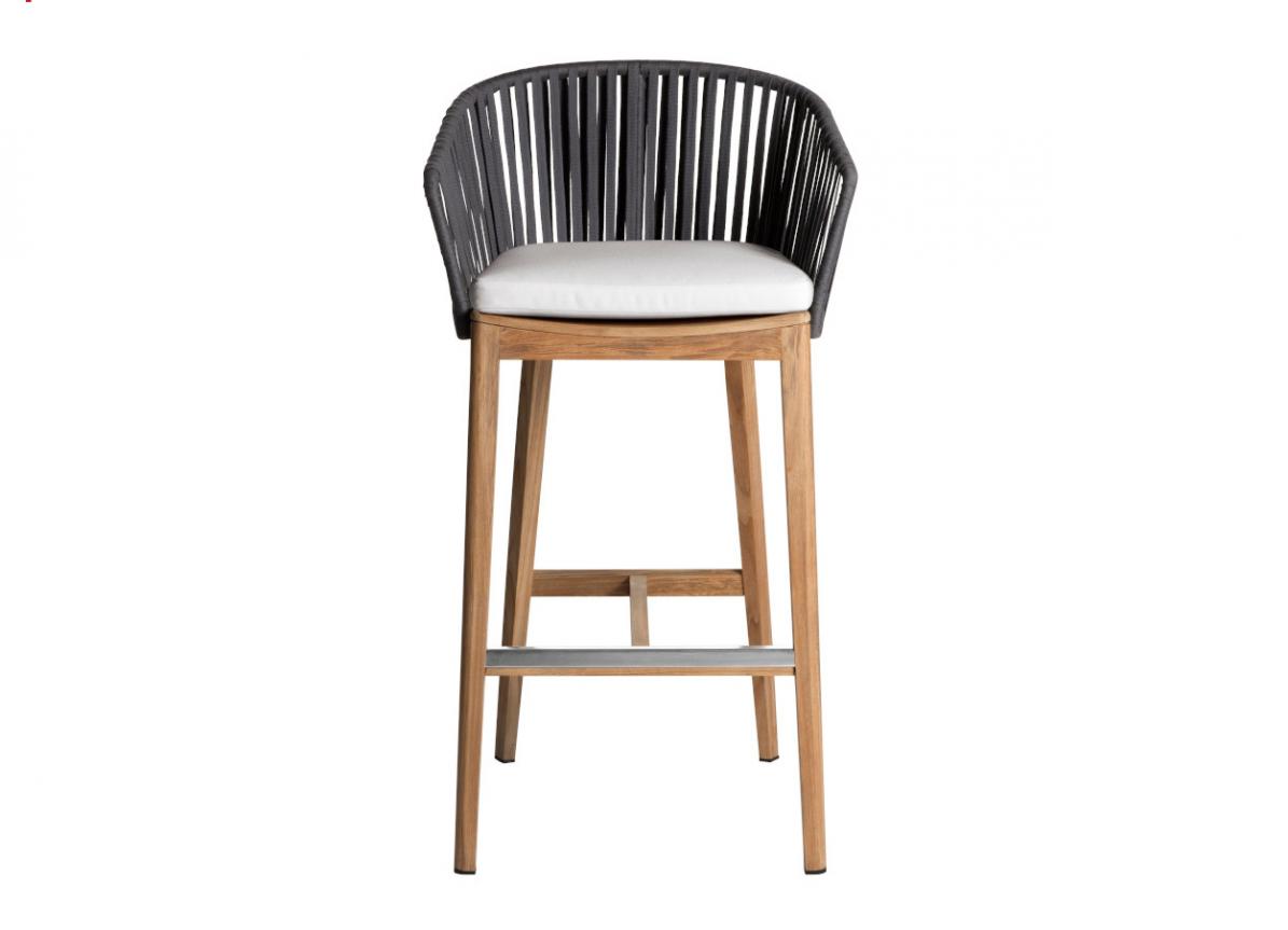 High stool Q3050. Made of solid oak wood, rope weave and padded cushion on the seat. Choice of wood (such as beech, oak, walnut, iroko, etc.) and fabrics (such as waterproof, alder, etc.). Available for indoor and outdoor use on request. Its special design serves the aesthetic and functional needs of your space in the best possible way. The stool has a 5-year quality guarantee. Free transport and assembly within Attica.
