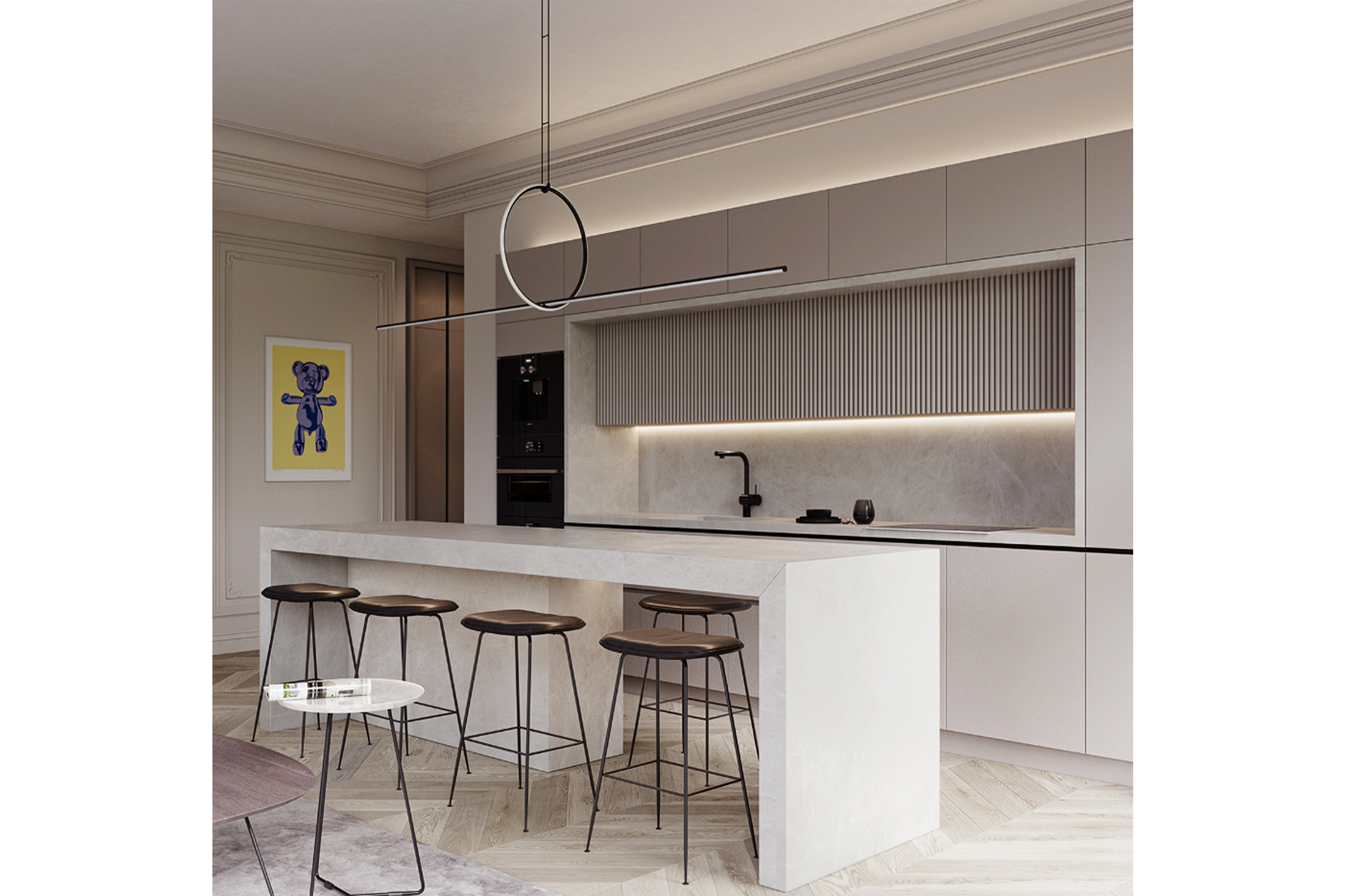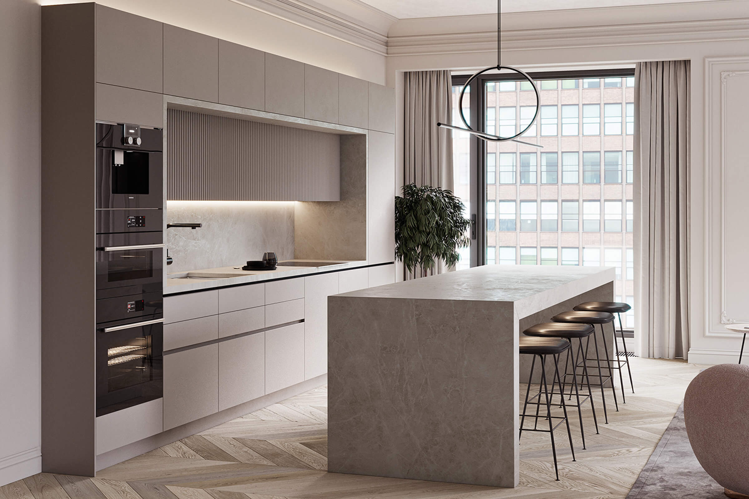 Αυτή η κουζίνα σίγουρα χαρίζει ηρέμια και γαλήνη στο χώρο , χάρη στη διακριτική παλέτα της και τη γήινη υφή του πετρώματος, επίσης σε ανοιχτή απόχρωση. Τα πορτάκια της συνδυάζουν διαφορετικά στοιχεία μοντέρνας γραμμής, όπως τα χωνευτά πόμολα και η επένδυση από βαμμένο πηχάκι που δίνει μία διαφορετική διάσταση στη λιτή γραμμή της κουζίνας.