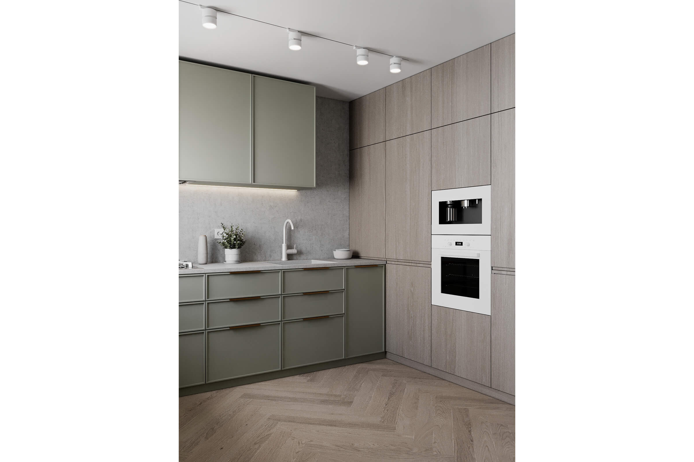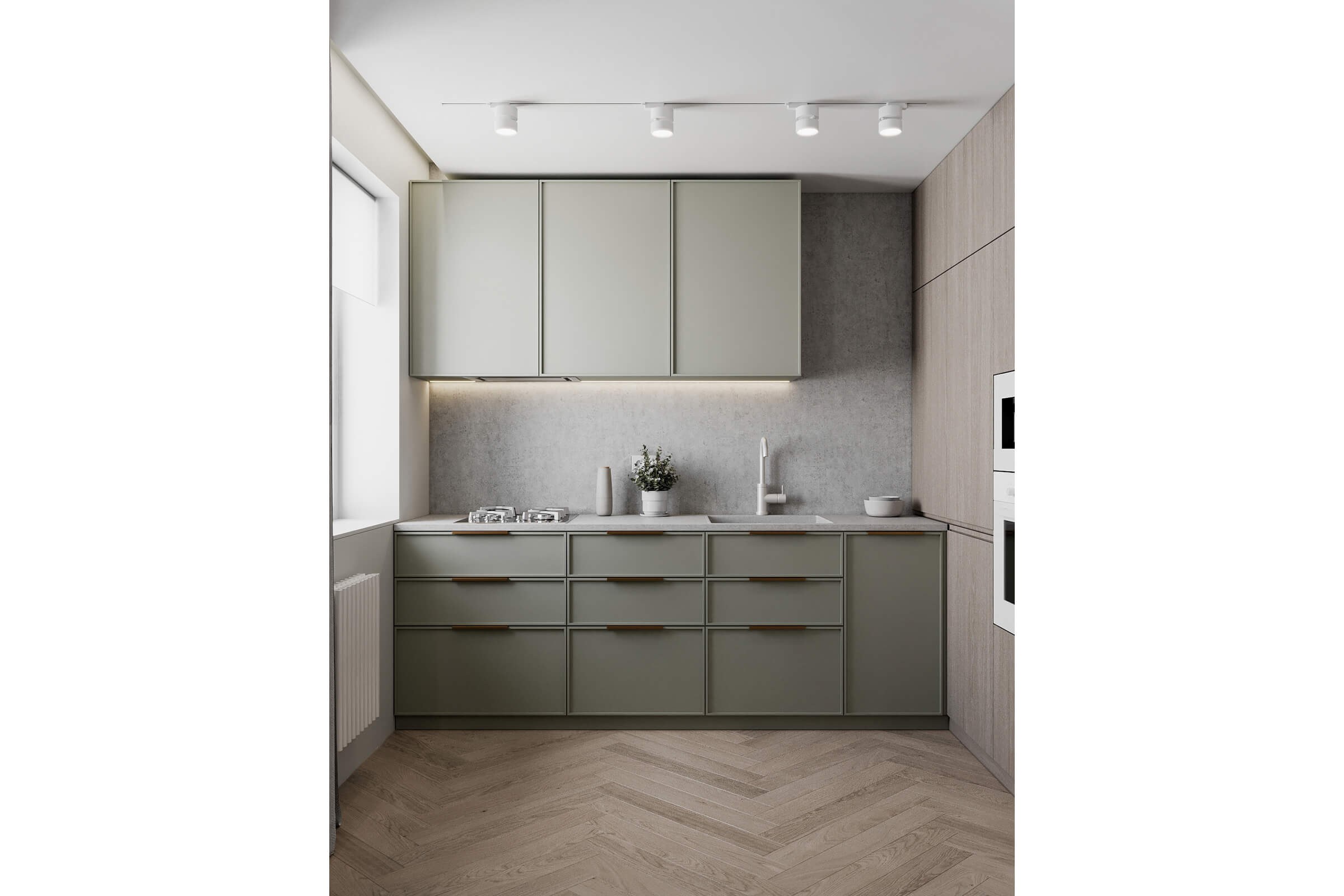 Αυτή η μικρή κουζίνα διαθέτει μια γοητευτική και ζεστή ατμόσφαιρα με τη ζεστή ξύλινη υφή της και τα όμορφα επιλεγμένα πράσινα ντουλάπια. Η υφή του ξύλου δημιουργεί μια ρουστίκ και φιλόξενη ατμόσφαιρα, προσθέτοντας φυσική ζεστασιά στο χώρο. Τα πράσινα ντουλάπια, προσεκτικά επιλεγμένα για να συμπληρώνουν τις αποχρώσεις του ξύλου, εμποτίζουν ένα αναζωογονητικό και γήινο χρώμα στο δωμάτιο.Kομψά, μοντέρνα πόμολα, προσθέτουν μια πινελιά σύγχρονου στυλ στο συνολικό σχέδιο.