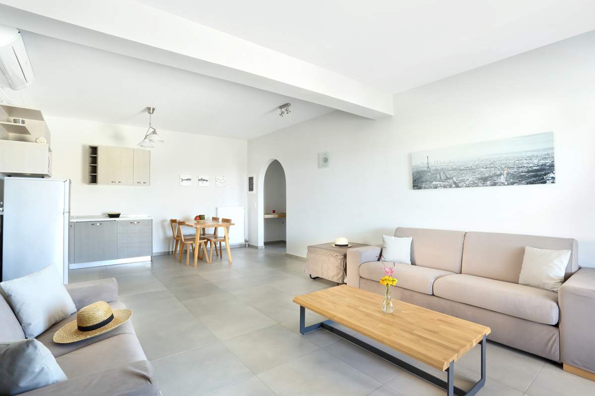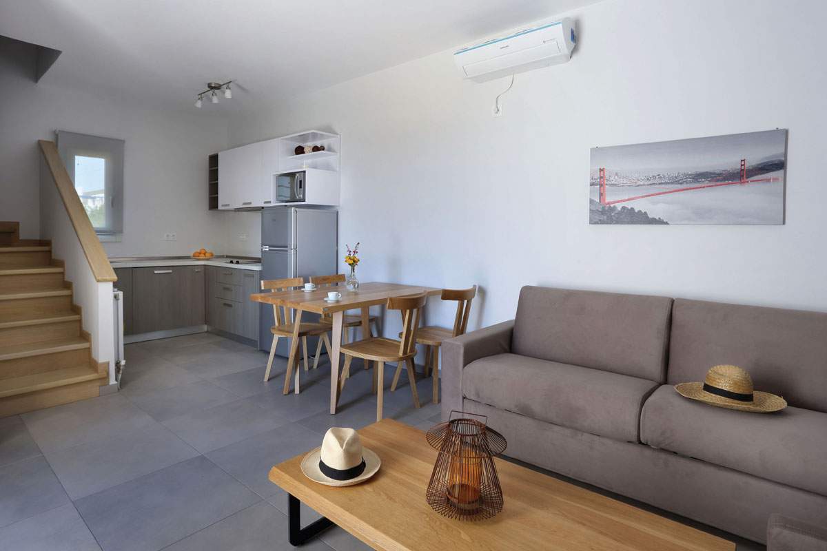Οι χώροι είναι άνετοι, φωτεινοί και πλήρως εξοπλισμένοι. Οι τοίχοι είναι σε παλ αποχρώσεις και τα επιλεγμένα και κατασκευασμένα από την GK MOBILI έπιπλα είναι σε διάφορες αποχρώσεις του ξύλου.