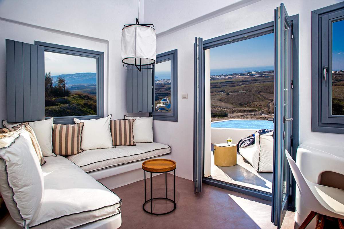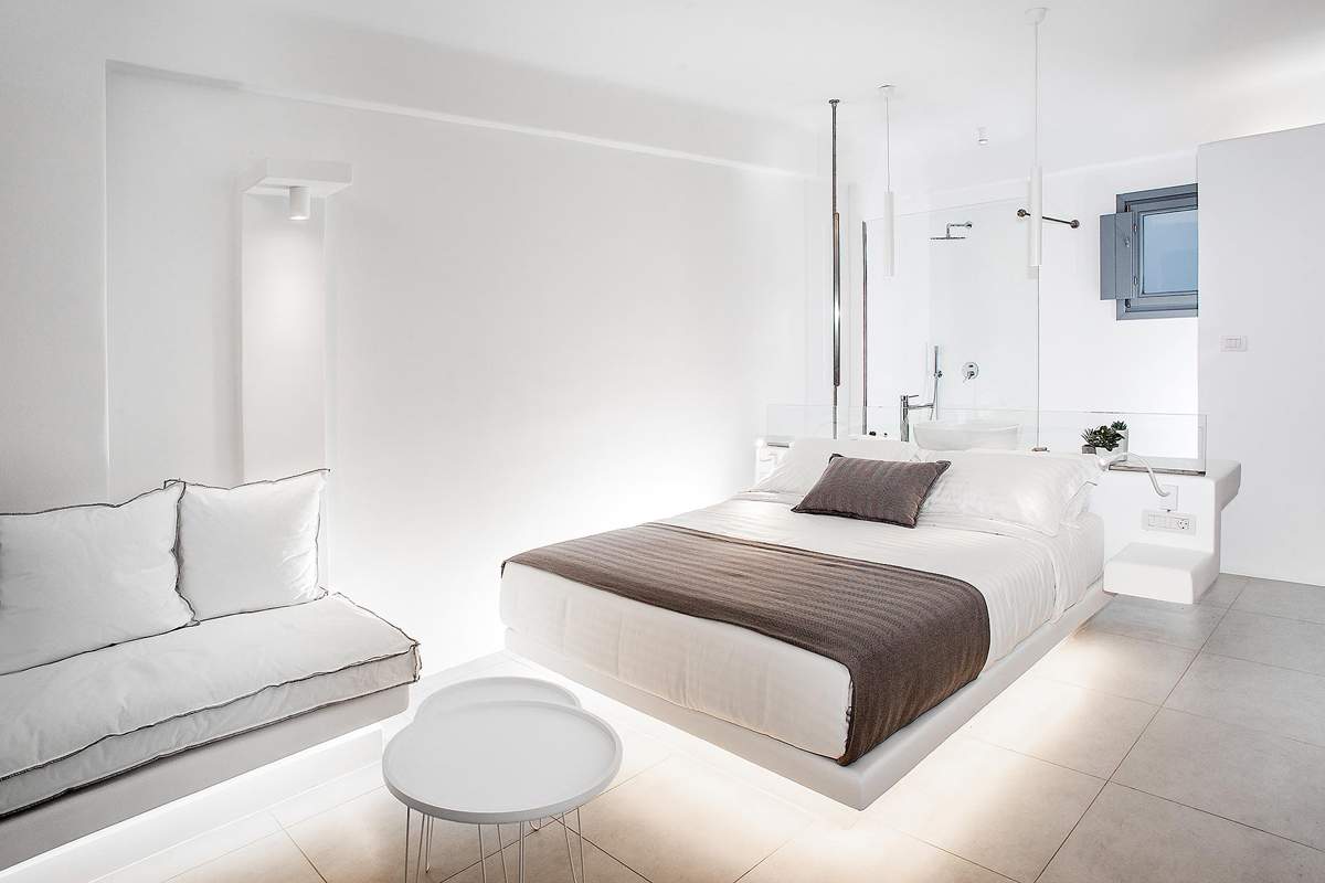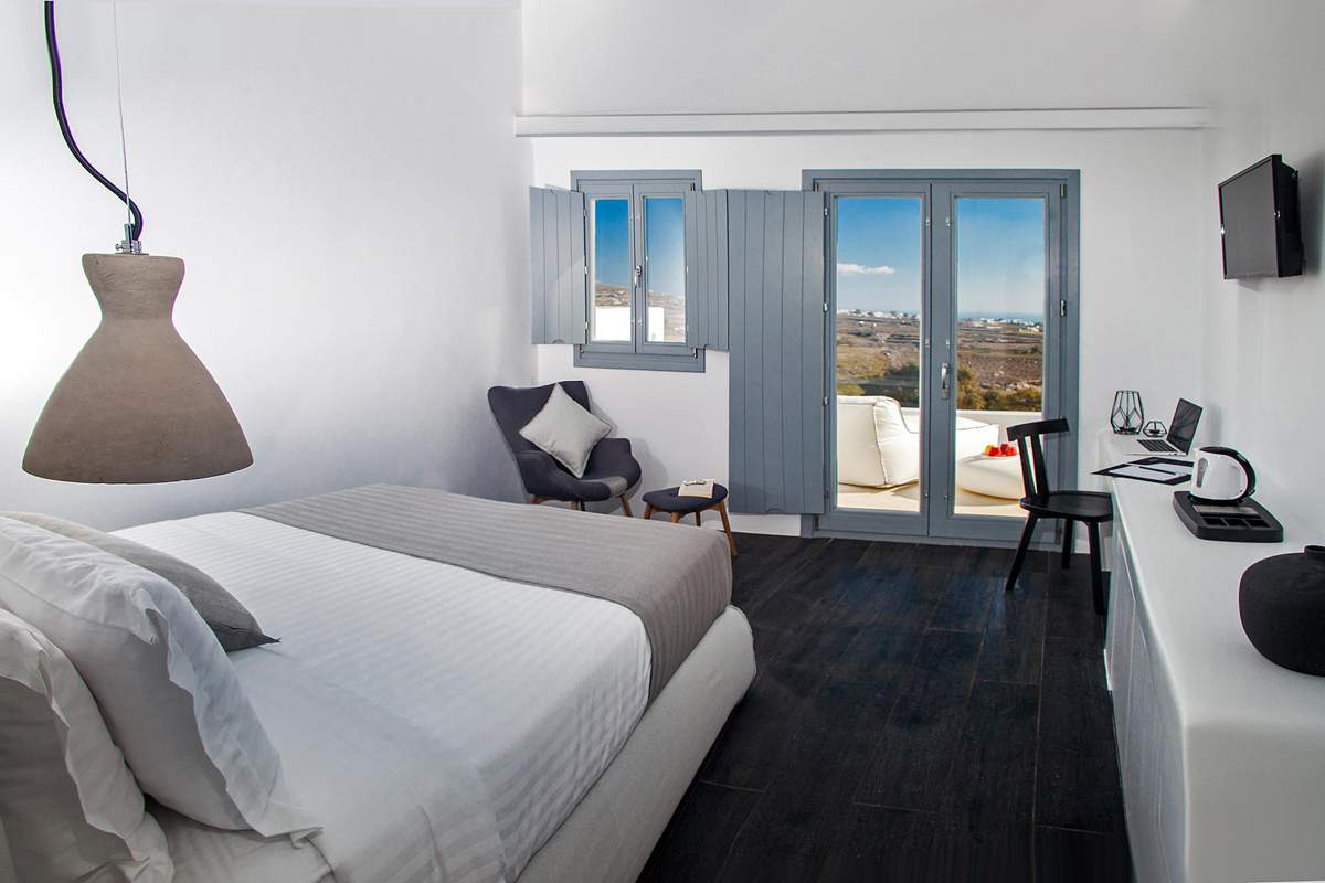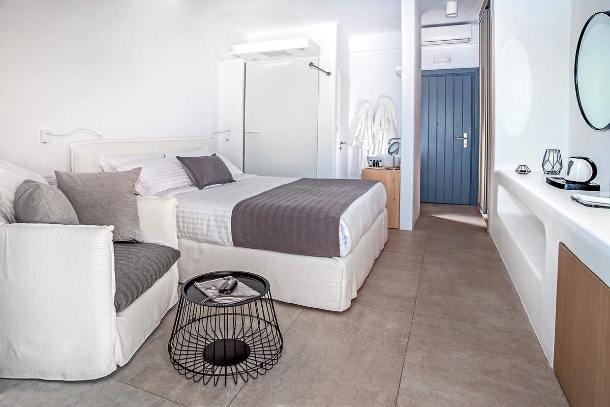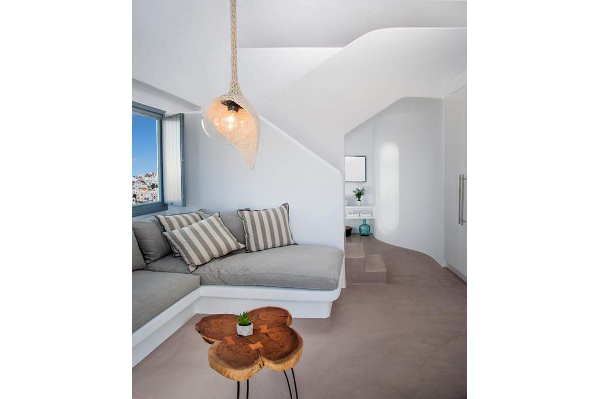 Σουίτες σχεδιασμένες σύμφωνα με την παραδοσιακή αρχιτεκτονική της Σαντορίνης, με ενιαία διαρρύθμιση και επιπλωμένες με τα μοναδικά minimal έπιπλα της GK MOBILI που συνδυάζουν τη διακριτική πολυτέλεια με την άνεση.