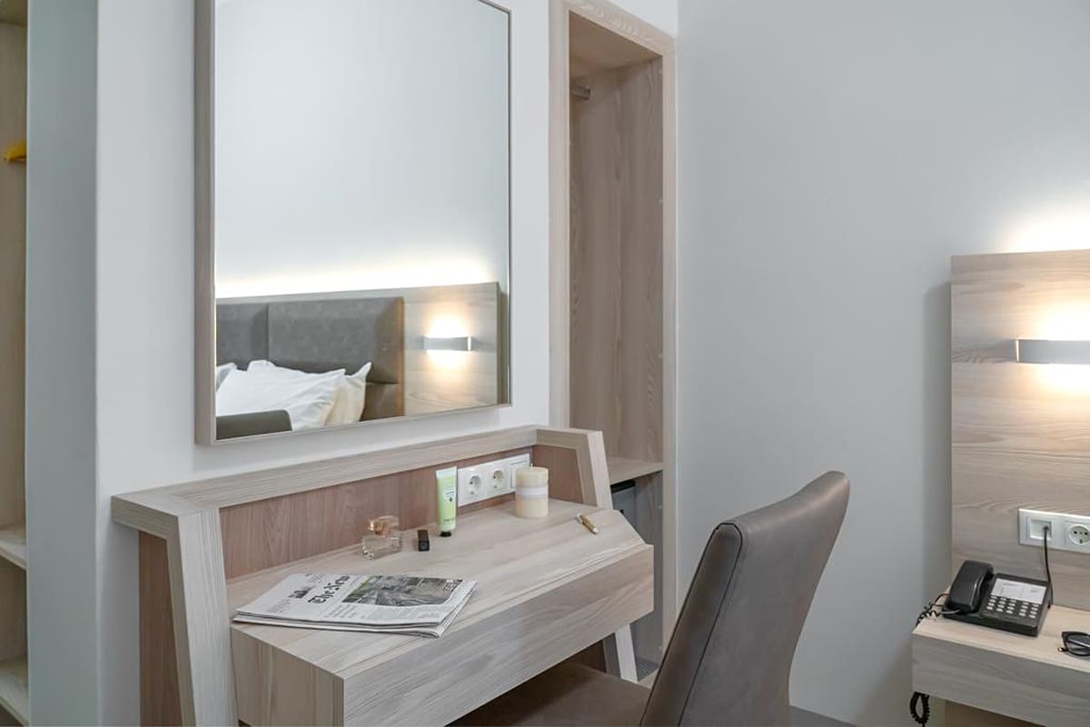 Το ανακαινισμένο δίκλινο δωμάτιο αποτελείται από παρκέ δάπεδο, λευκούς τοίχους και ανοιχτόχρωμη γήινη επίπλωση μινιμαλιστικού design.