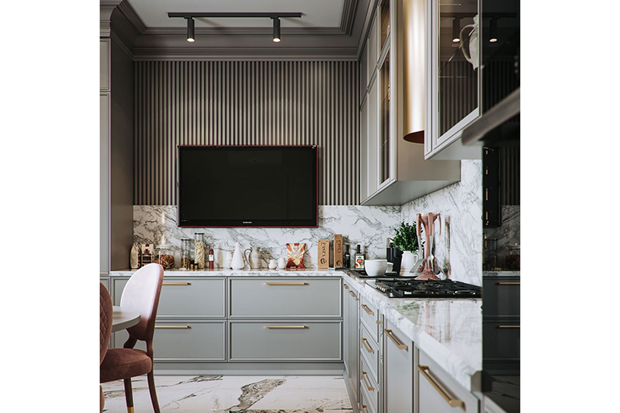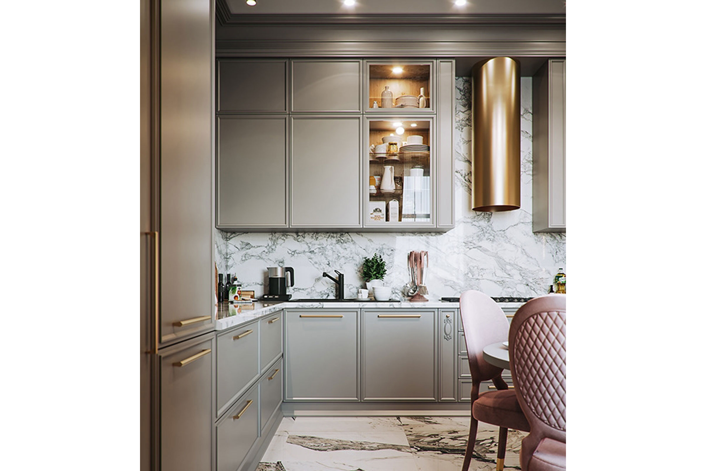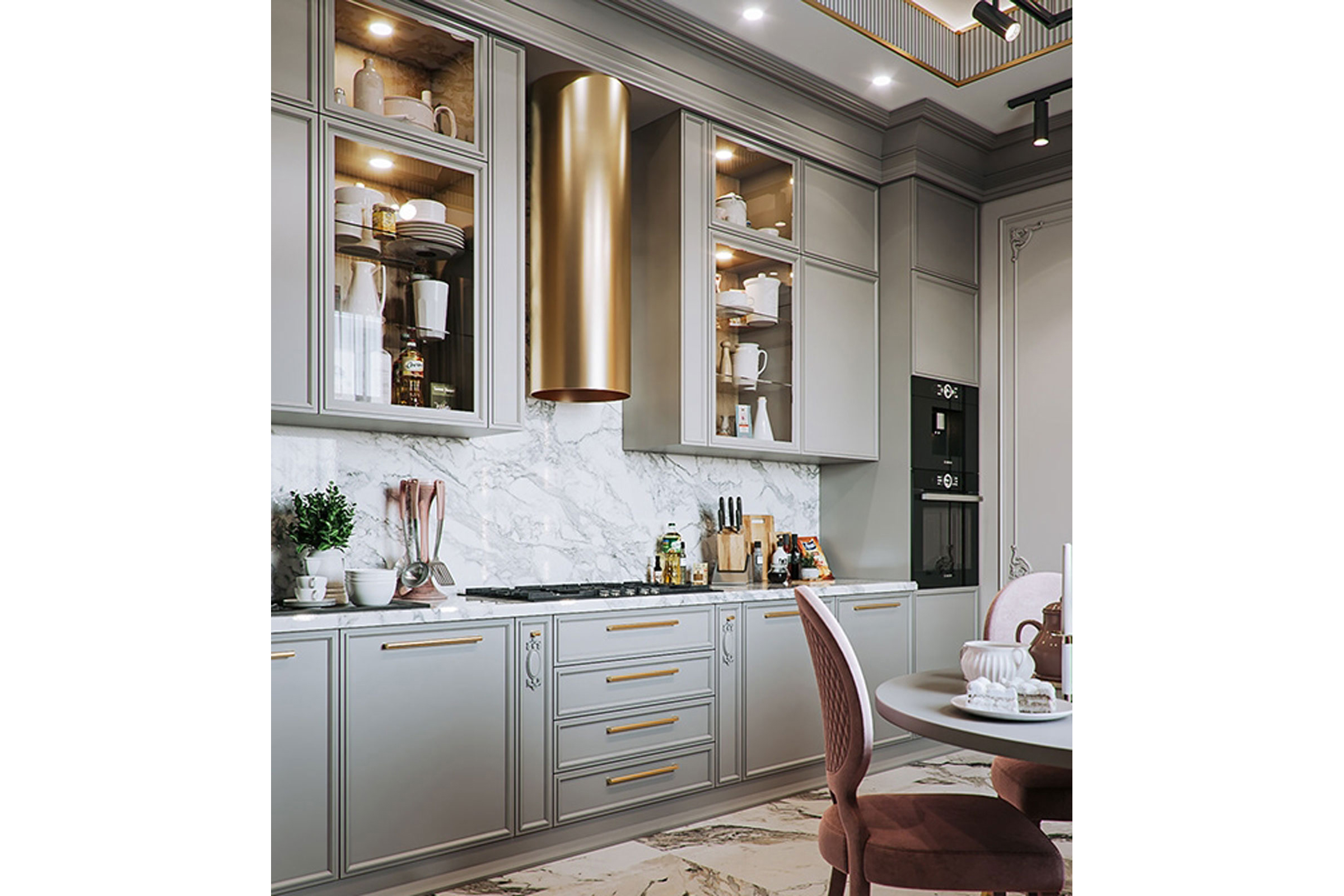 Αυτή η διαχρονική νεοκλασική πολυτελής κουζίνα, διακοσμημένη με ένα λαμπερό χρυσό φινίρισμα αποπνέει χλιδή και φινέτσα. Τα πορτάκια της κουζίνας είναι διακοσμημένα με κορνίζα η οποία δημιουργεί βάθος , με την οποία έρχεται σε τέλεια γεωμετρία το κλασικό χρυσό πόμολο.