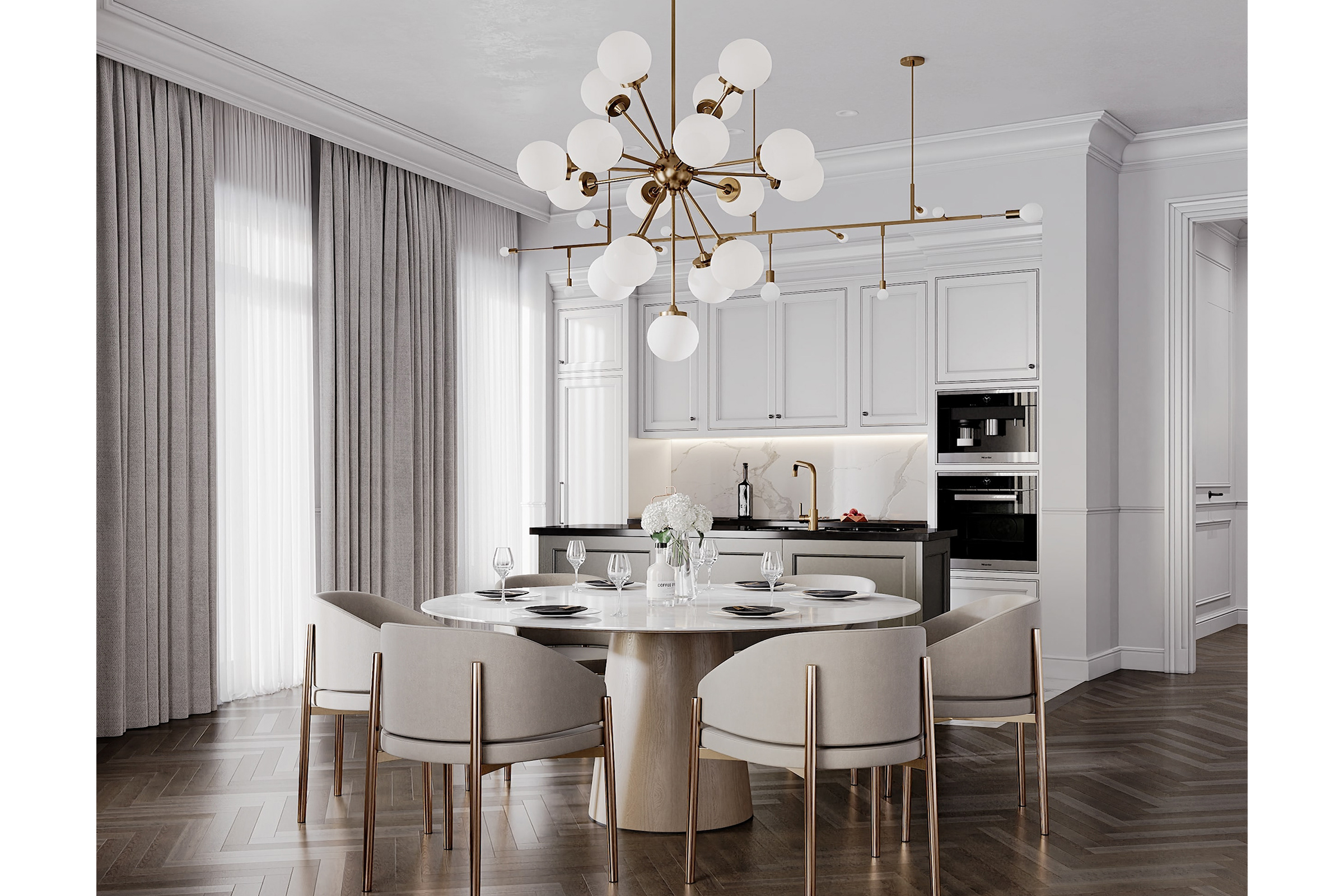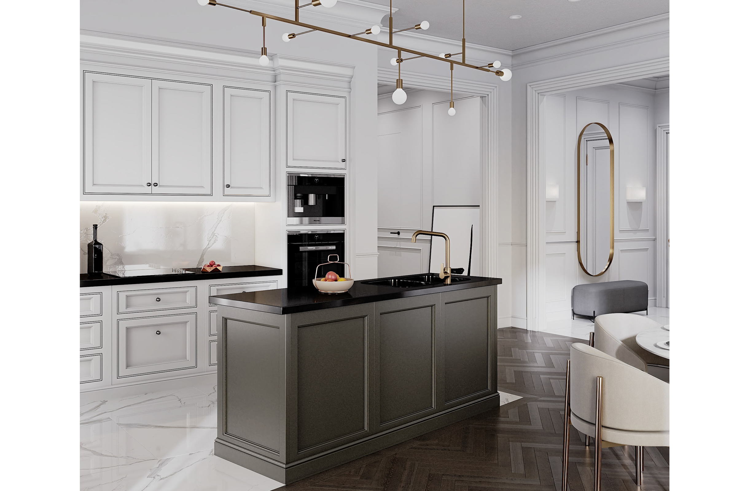 Η βάση αυτής της κουζίνας βασίζεται στις αρχές του νεοκλασικού σχεδιασμού, με καθαρές γραμμές, συμμετρική ισορροπία και μια αίσθηση διαχρονικού μεγαλείου. Η σχολαστική προσοχή στη λεπτομέρεια είναι εμφανής παντού, από το περίτεχνο υλικό στο ντουλάπι μέχρι τις λεπτώς κατασκευασμένες κορνίζες και τις διακοσμητικές πινελιές.