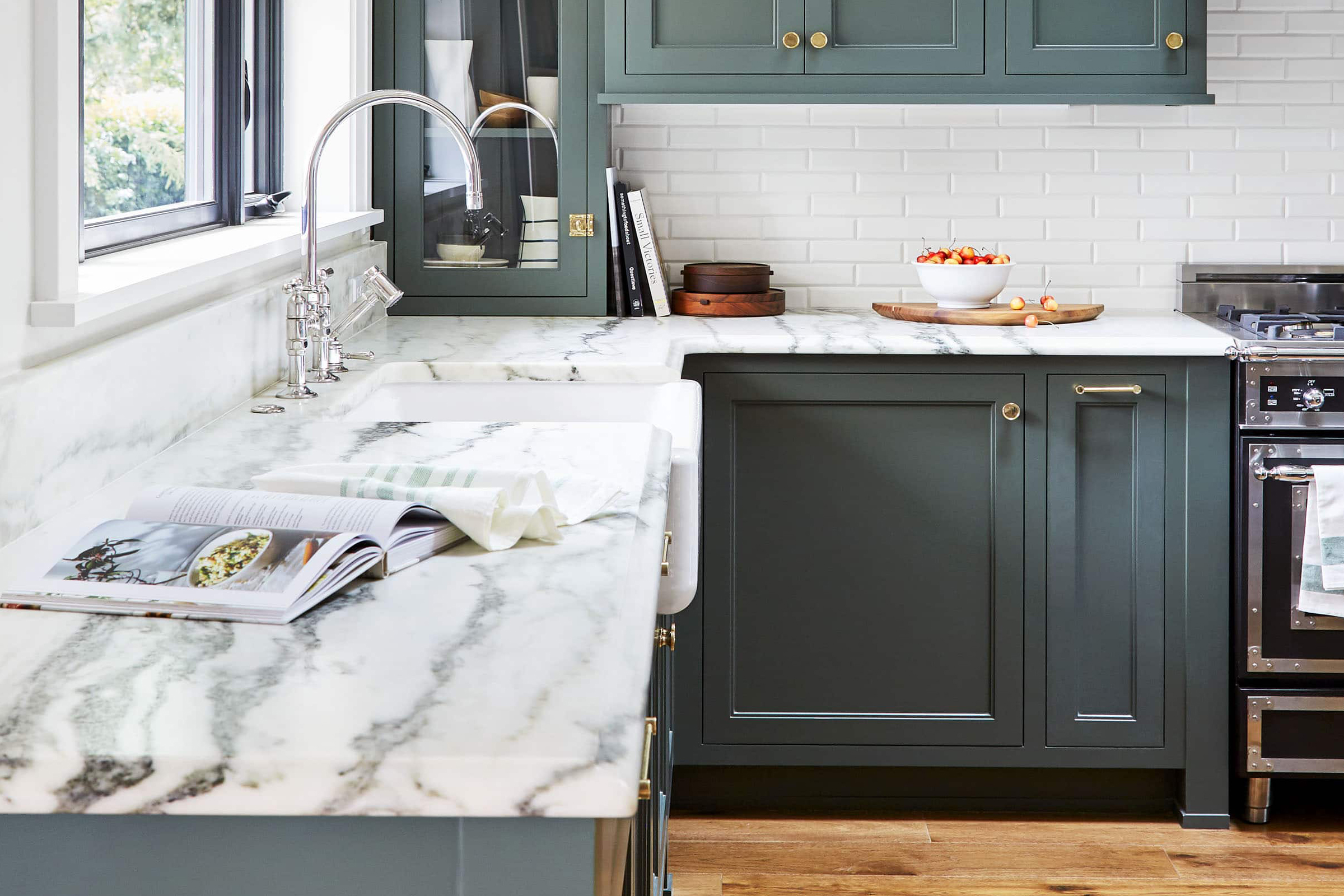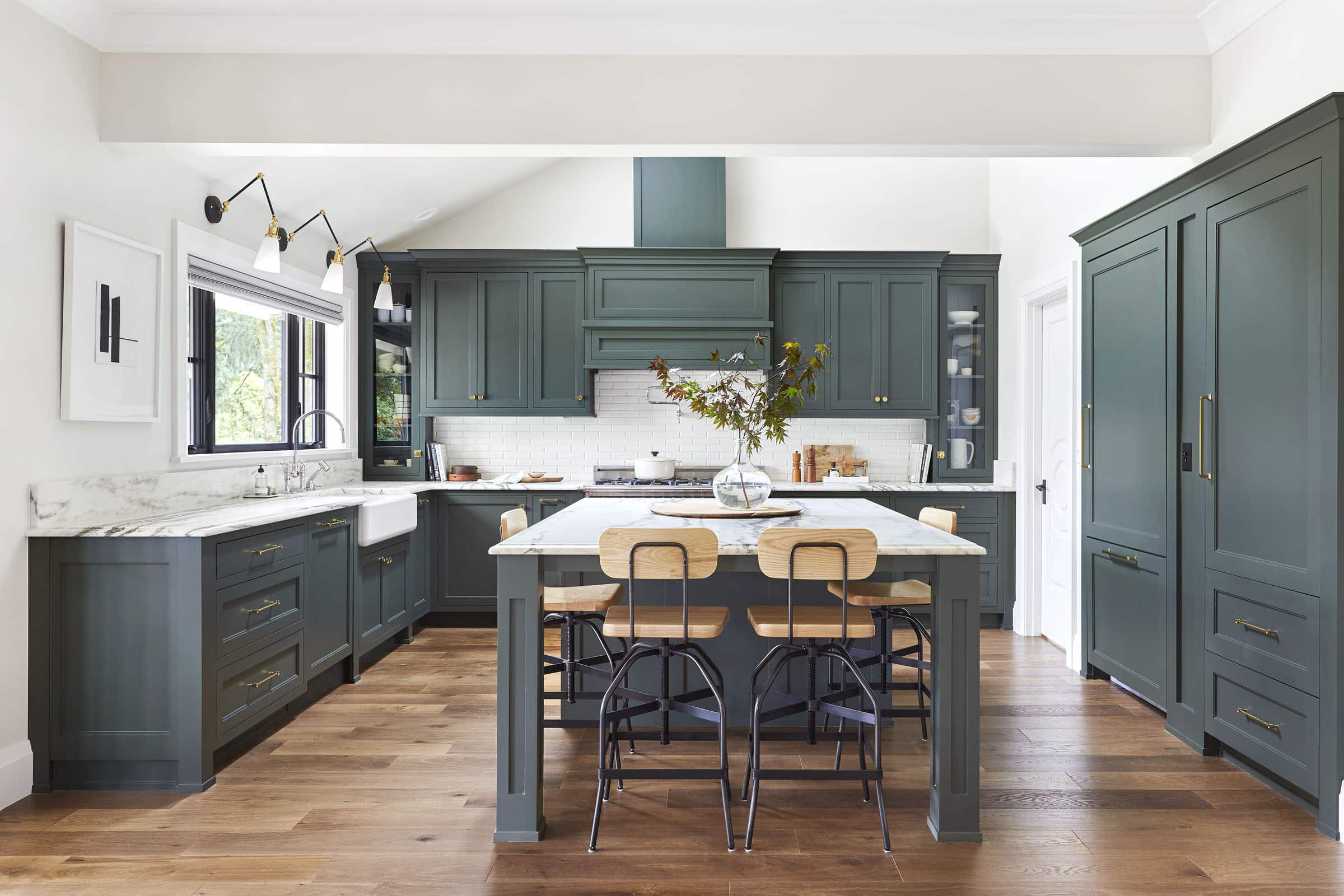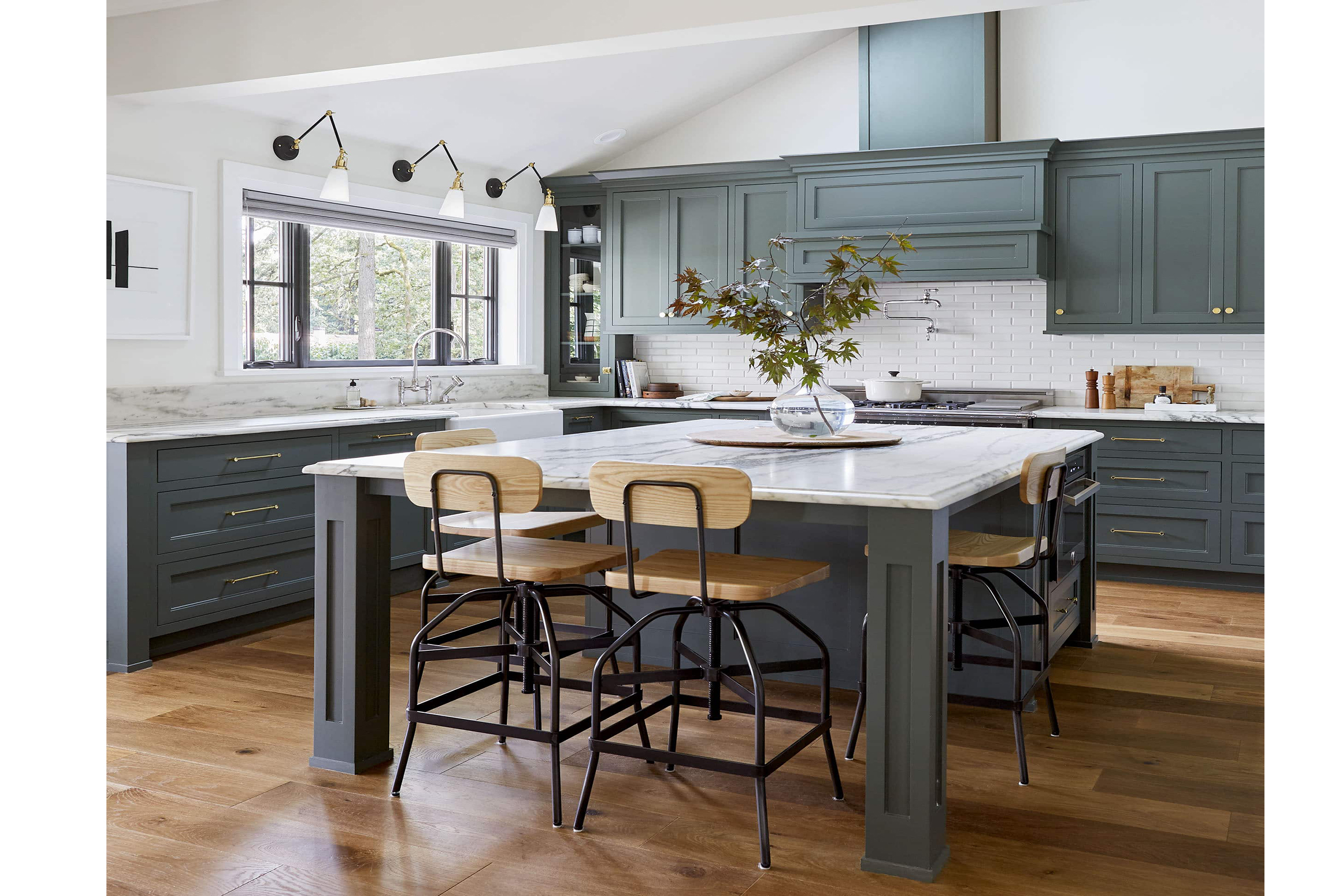 Aυτή η καταπράσινη εξοχική κουζίνα με μάρμαρο και ένα μεγάλο νησί είναι ένας παράδεισος άνεσης και εκλέπτυνσης. Ο συνδυασμός των κλασικών υλικών, όπως το μάρμαρο και το ξύλο, με τις σύγχρονες ανέσεις δημιουργεί έναν χώρο που δεν είναι μόνο οπτικά ελκυστικός, αλλά και σχεδιασμένος για τις απολαύσεις του μαγειρέματος, της συγκέντρωσης και της δημιουργίας αγαπημένων αναμνήσεων.