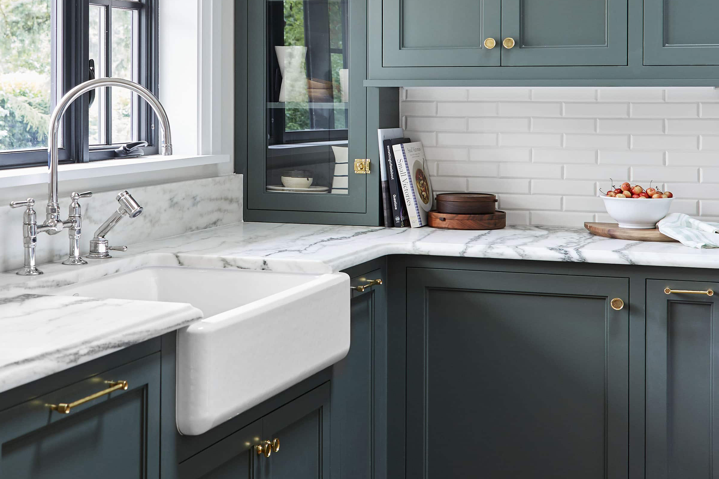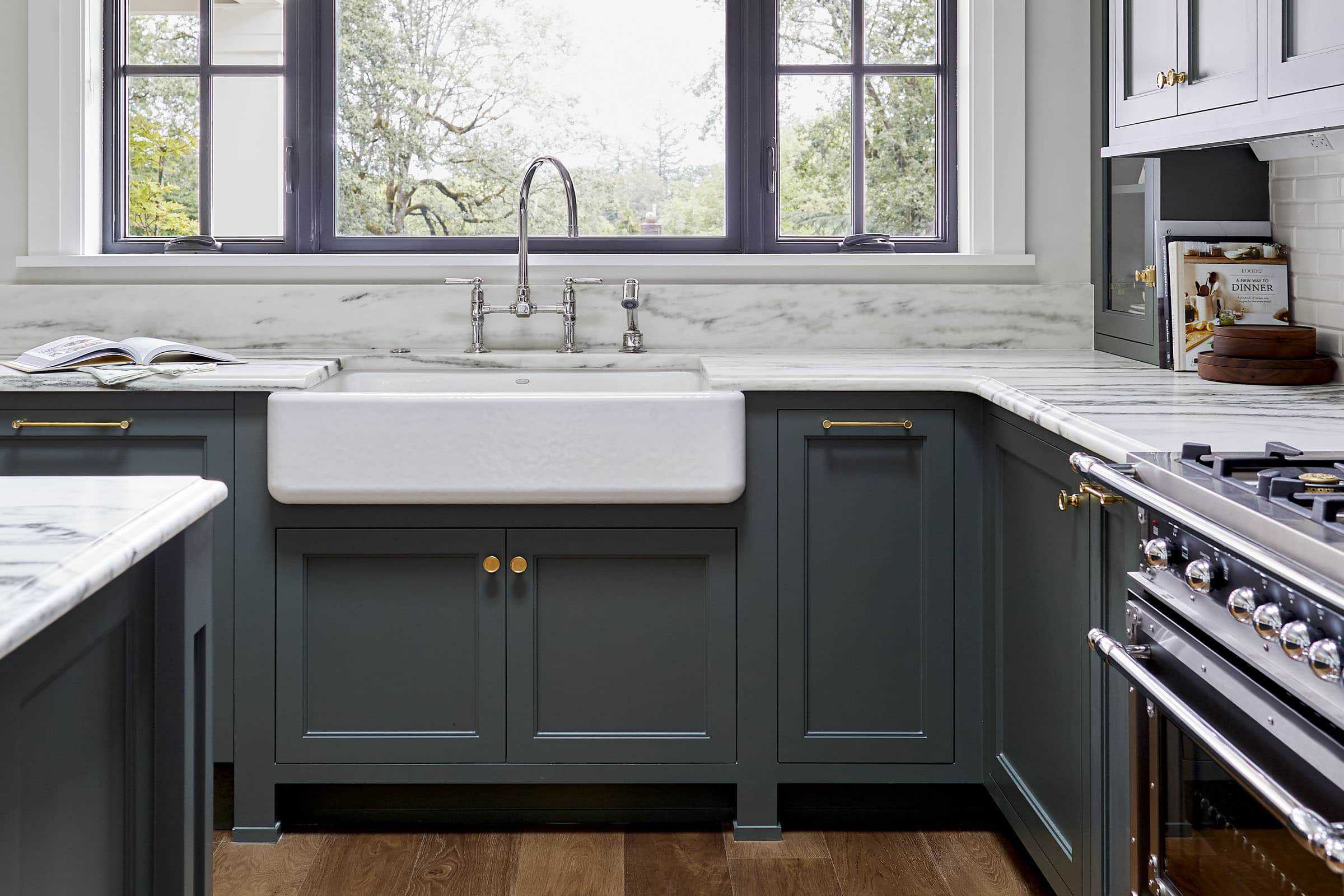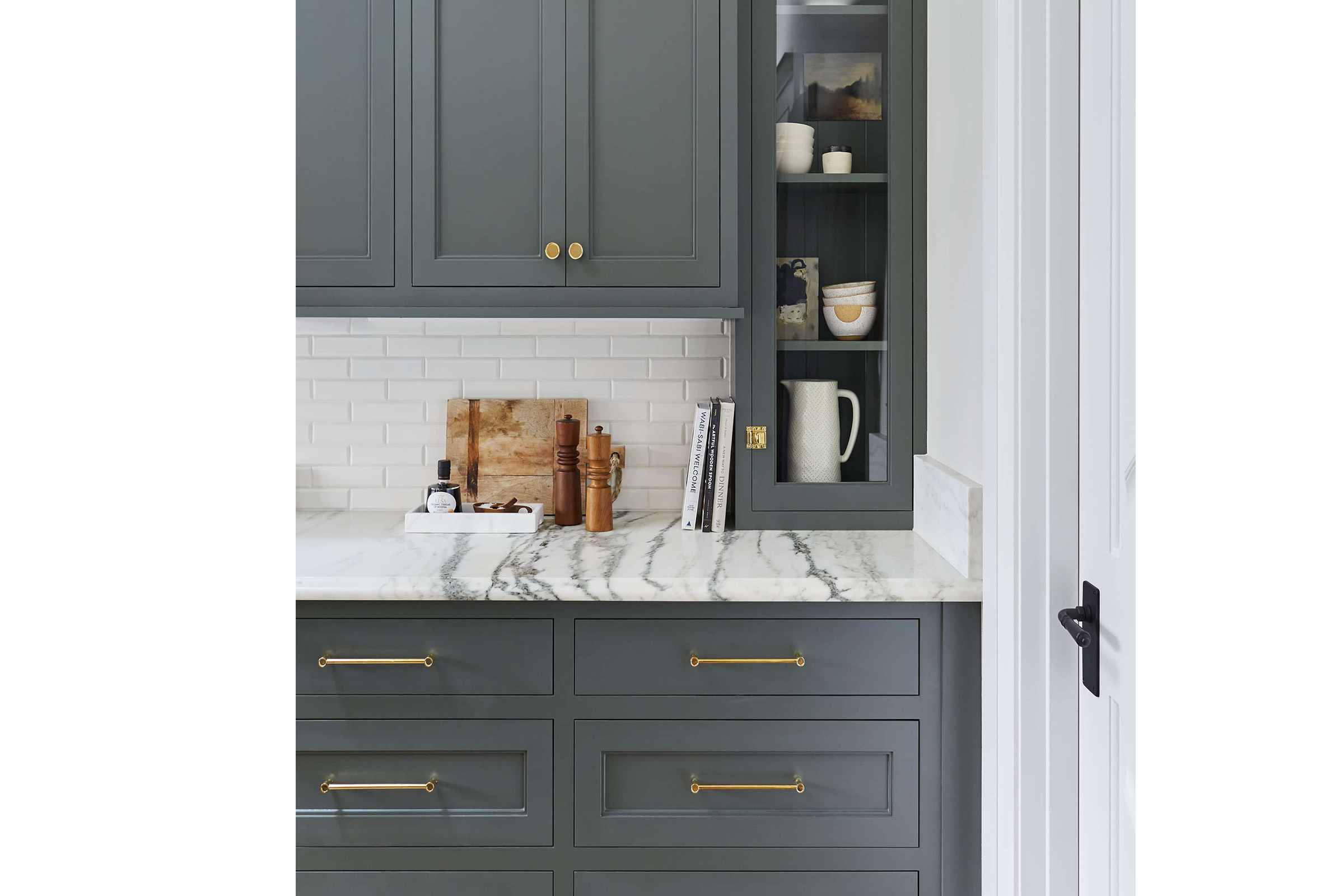 Aυτή η καταπράσινη εξοχική κουζίνα με μάρμαρο και ένα μεγάλο νησί είναι ένας παράδεισος άνεσης και εκλέπτυνσης. Ο συνδυασμός των κλασικών υλικών, όπως το μάρμαρο και το ξύλο, με τις σύγχρονες ανέσεις δημιουργεί έναν χώρο που δεν είναι μόνο οπτικά ελκυστικός, αλλά και σχεδιασμένος για τις απολαύσεις του μαγειρέματος, της συγκέντρωσης και της δημιουργίας αγαπημένων αναμνήσεων.