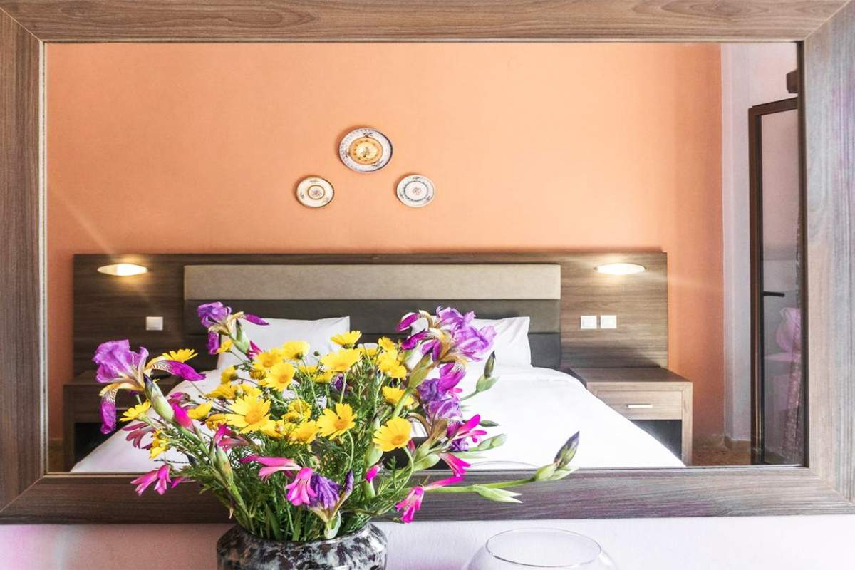Δωμάτια σχεδιασμένα με minimal επίπλωση γήινων τόνων, καρέκλες ντυμένες με σκούρα χρώματα και πλήθος διακοσμητικών αντικειμένων που χαρίζουν μια νησιώτικη πινελιά.