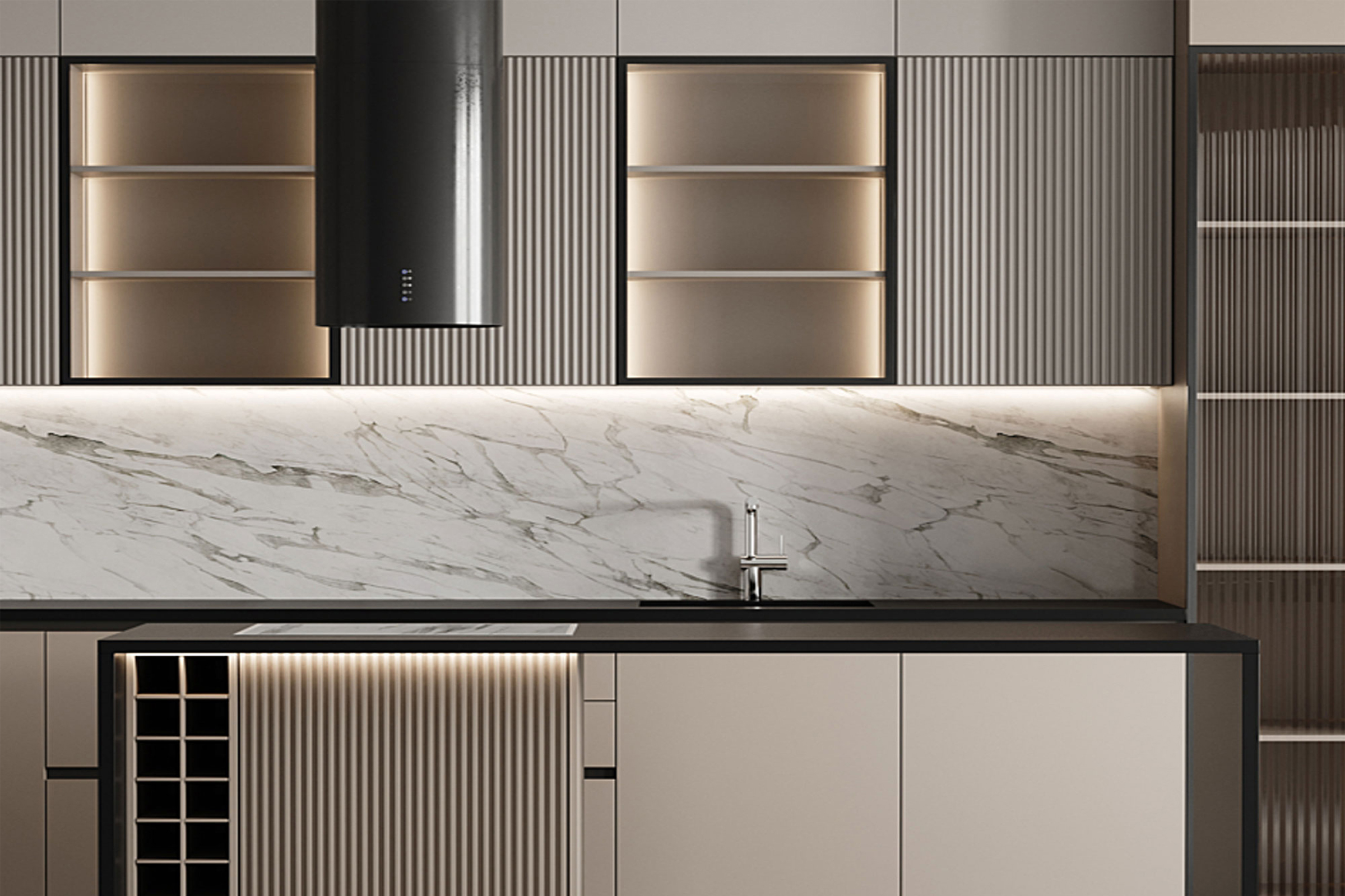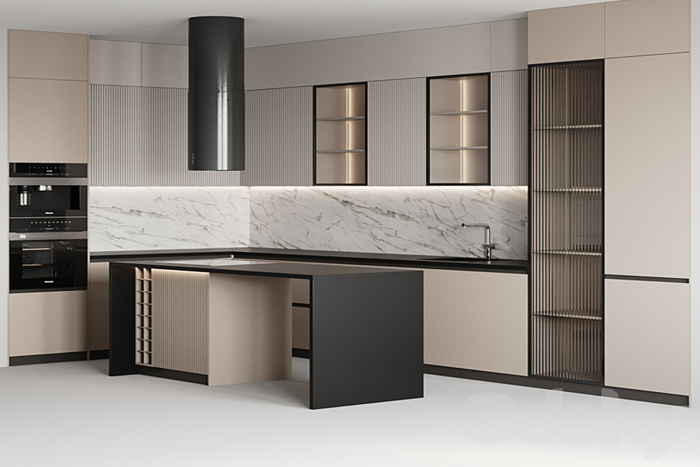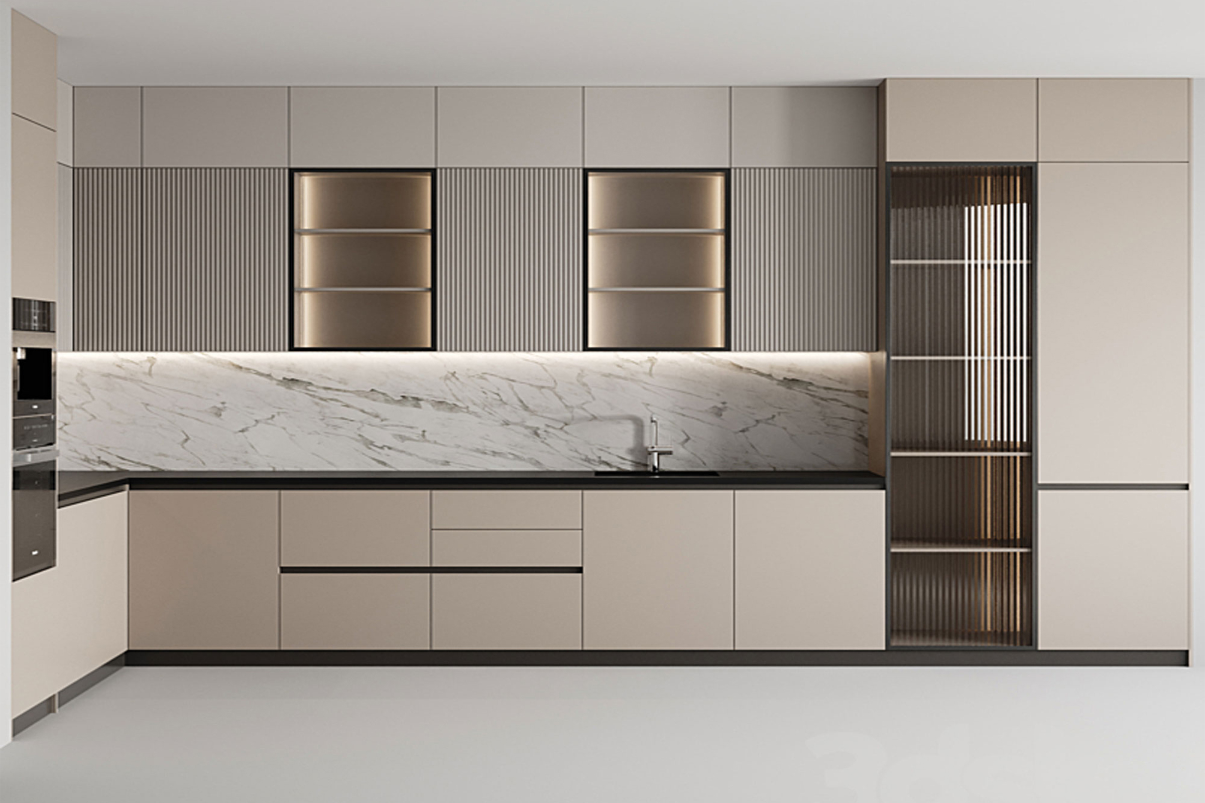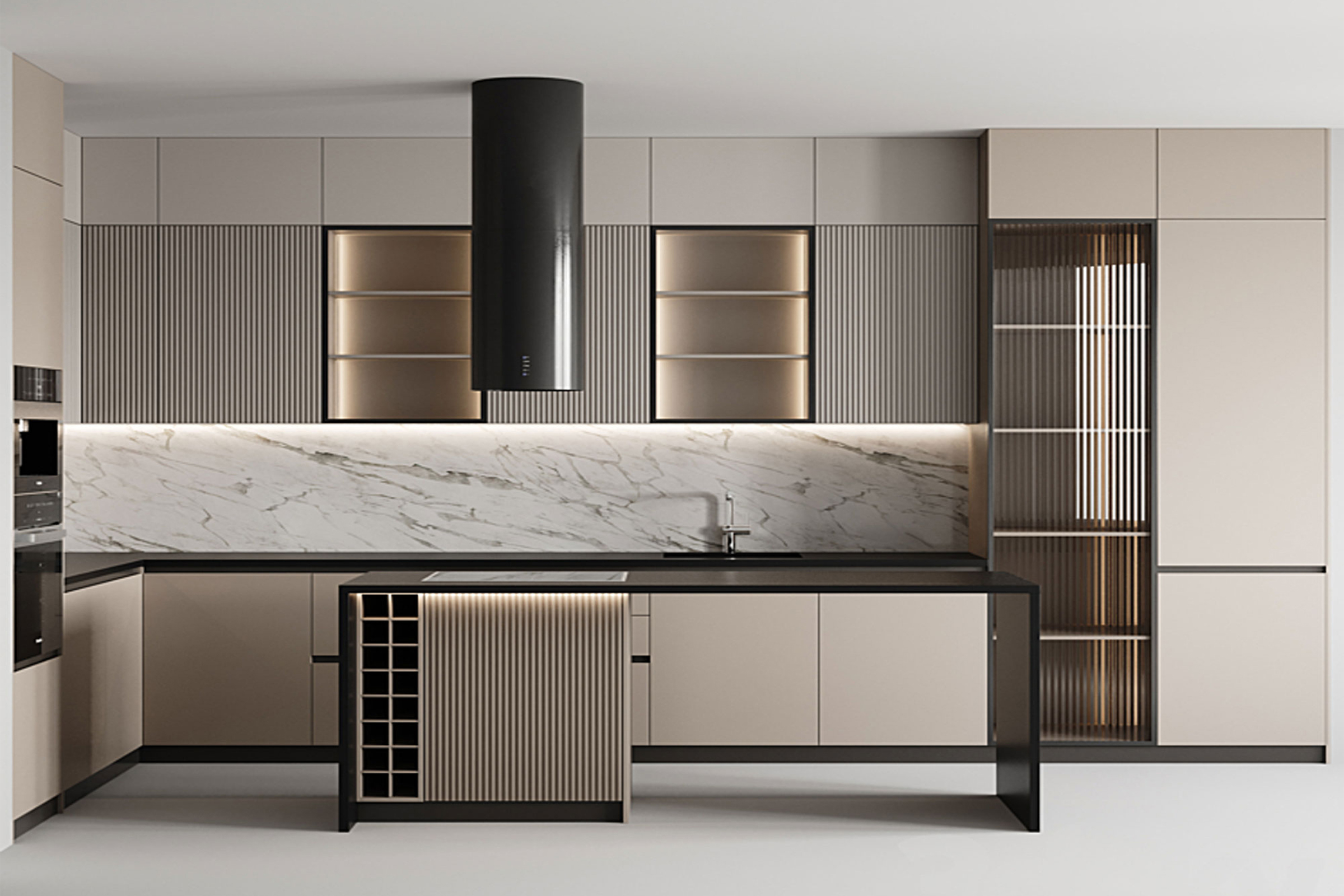 Η κουζίνα αυτή “κινείται” σε μία διαχρονική χρωματική παλέτα με μοντέρνα σχεδιαστικά στοιχεία. Οι πόρτες του ντουλαπιού είναι κατασκευασμένες με διαφανή γυάλινες επιφάνειες, και οι λαβές τους είναι χωνευτές με μαύρο προφίλ που κάνει μία ωραία αντίθεση στην “ήρεμη” παλέτα της κουζίνας. Η επένδυση από πιχάκι στα ντουλάπια της κουζίνας και της νησίδας δίνουν μία άλλη διάσταση και διατηρούν τη μοντέρνα και σύγχρονη αισθητική.