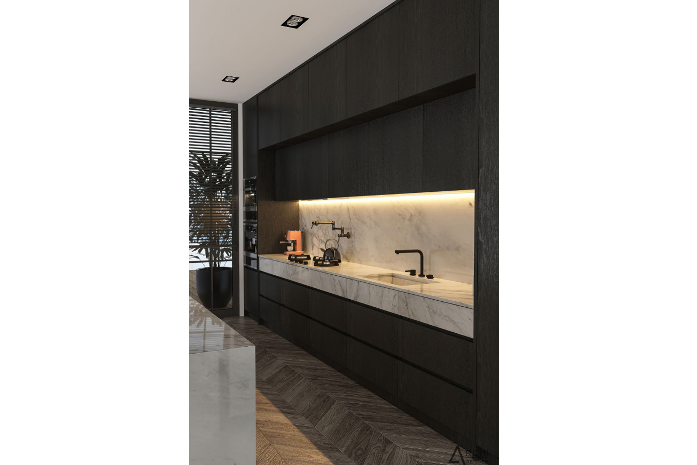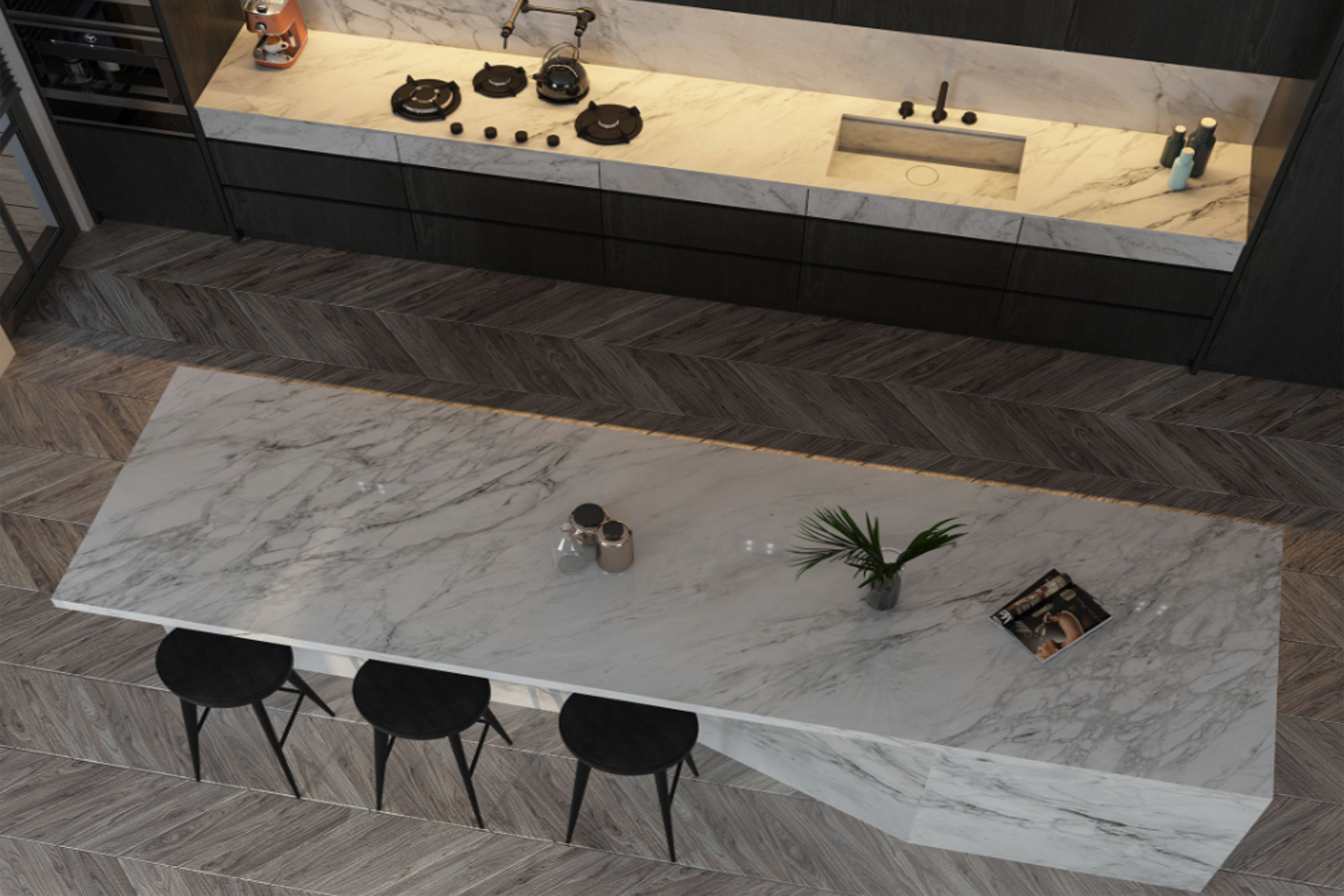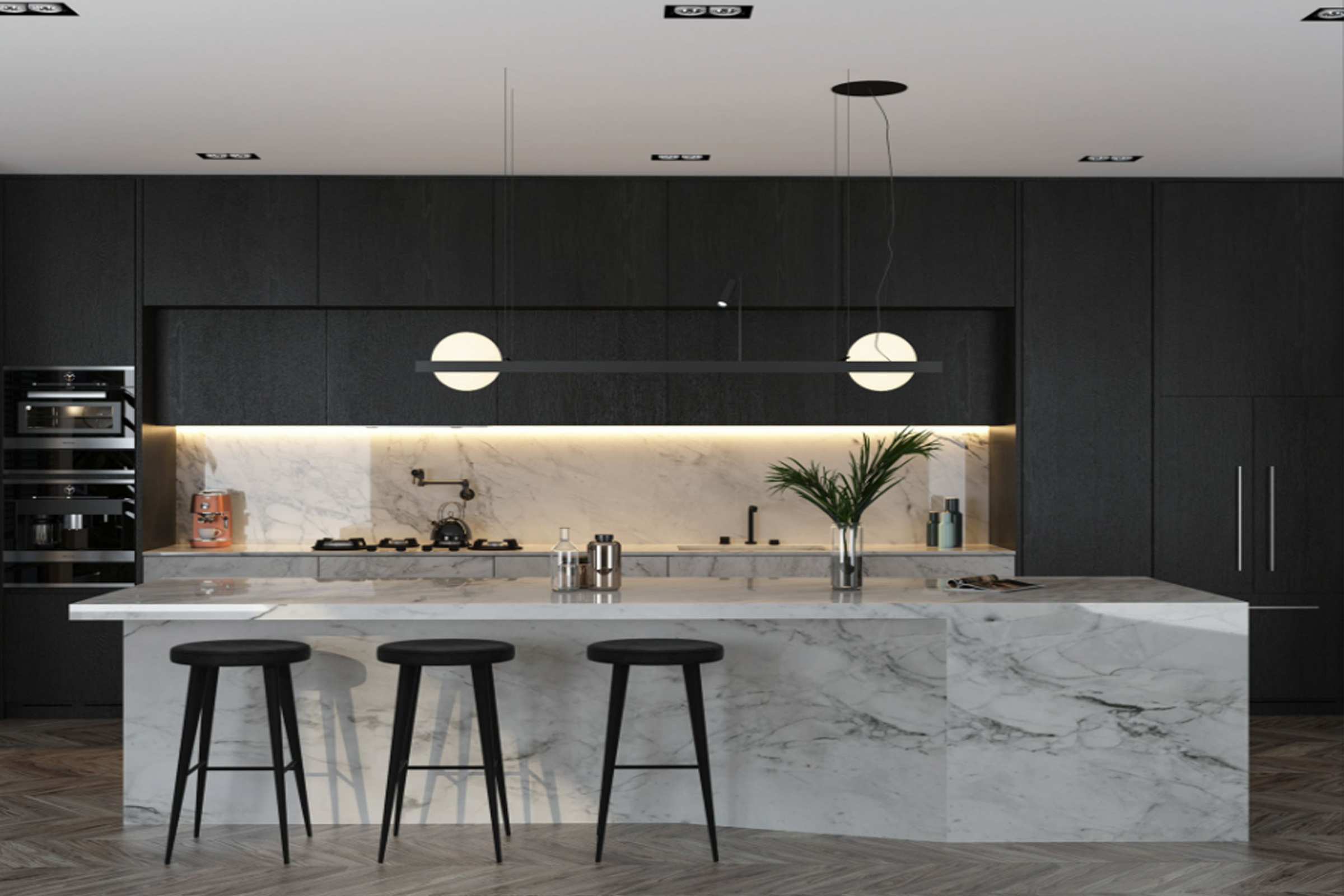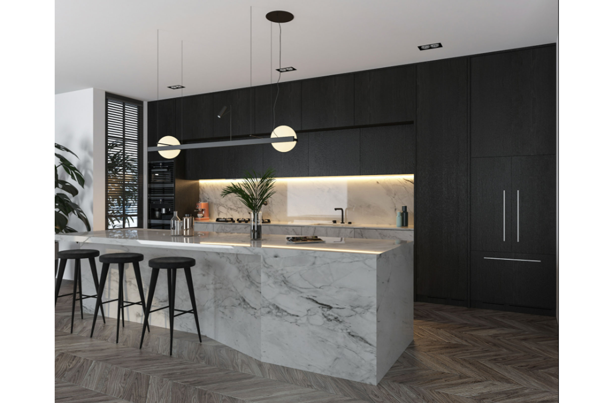 Μία άκρως μοντέρνα κουζίνα , χάρη στην κομψότητα που προσδίδει η μαύρη απόχρωση του ξύλου, η ανοιχτή διάταξη και η ιδιαίτερη γεωμετρία της νησίδας σε ύφος μαρμάρου. Η νησίδα με την αυστηρή της γραμμή τραβάει τα βλέμματα και προσθέτει ένα διαφορετικό όγκο στο χώρο ,που κάνει τον συνολικό σχεδιασμό πιο ενδιαφέρον.