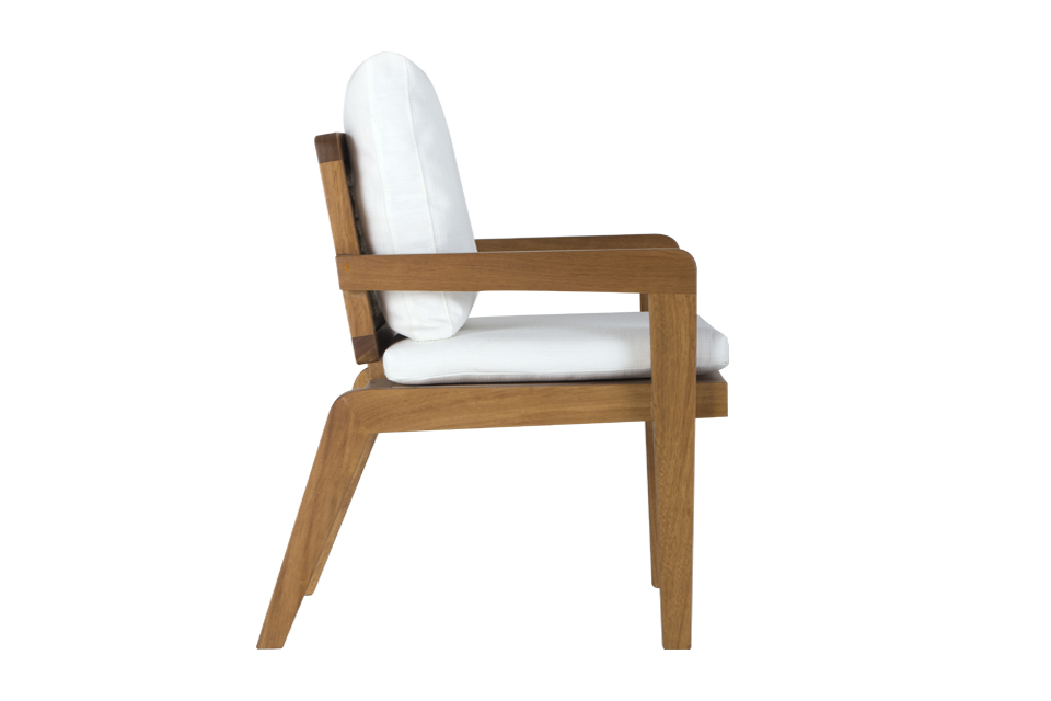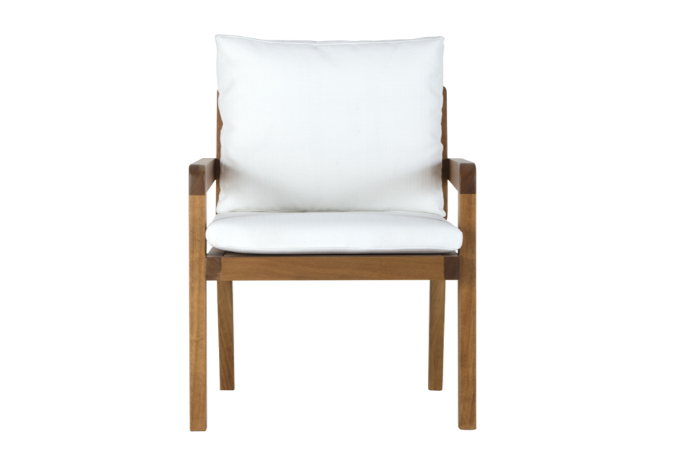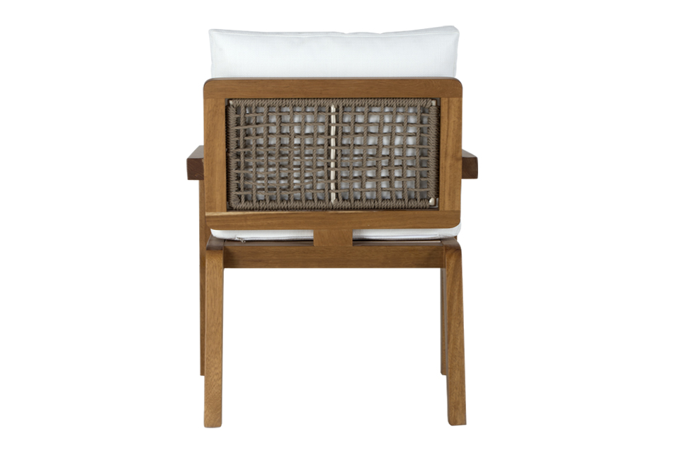Καρέκλα Εξωτερικού Χώρου TS200. Kατασκευάζεται από μασίφ ξύλο ιρόκο, και μαξιλάρες από αδιάβροχο ύφασμα με αντηλιακή προστασία UVA .Η προσθήκη σχοινιού στην πλάτη συνδυάζεται ιδανικά με τη φυσική γοητεία του ξύλου. Δυνατότητα επιλογής ξύλου (όπως οξιά, δρυς, καρυδιά, ιρόκο κ.α.) και υφασμάτων (αδιάβροχο, αλέκιαστο κ.α.) Διατίθεται για εσωτερικό και εξωτερικό χώρο κατόπιν παραγγελίας. Σχεδιασμένη σε minimal, λιτές γραμμές, εξυπηρετεί τις αισθητικές και λειτουργικές ανάγκες του χώρου σας. Η καρέκλα έχει 5 χρόνια εγγύηση ποιότητας.